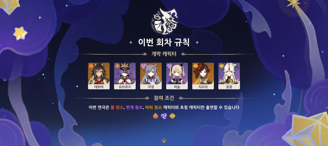 이번 회차는 불 원소, 번개 원소, 바위 원소와 초청 캐릭터만 출전할 수 있으며 매 공연마다 점점 난이도가 올라가게 됩니다.