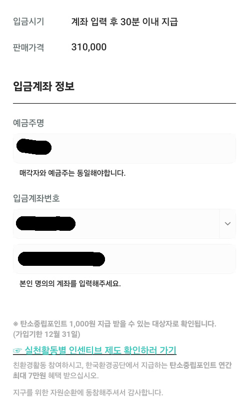실제로 입금은 판매완료 카카오톡이 오고 계좌정보를 입력하면 1시간 안에 바로 입금됩니다.