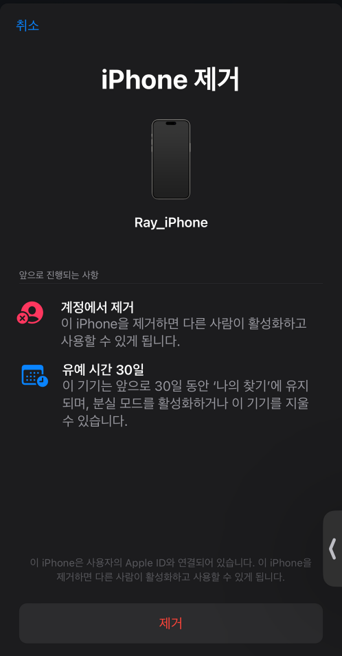 그리고 다시 나의 찾기를 실행해 기기목록에서 아이폰을 선택하고 제거를 탭하면 아래 캡처화면을 볼 수 있습니다.